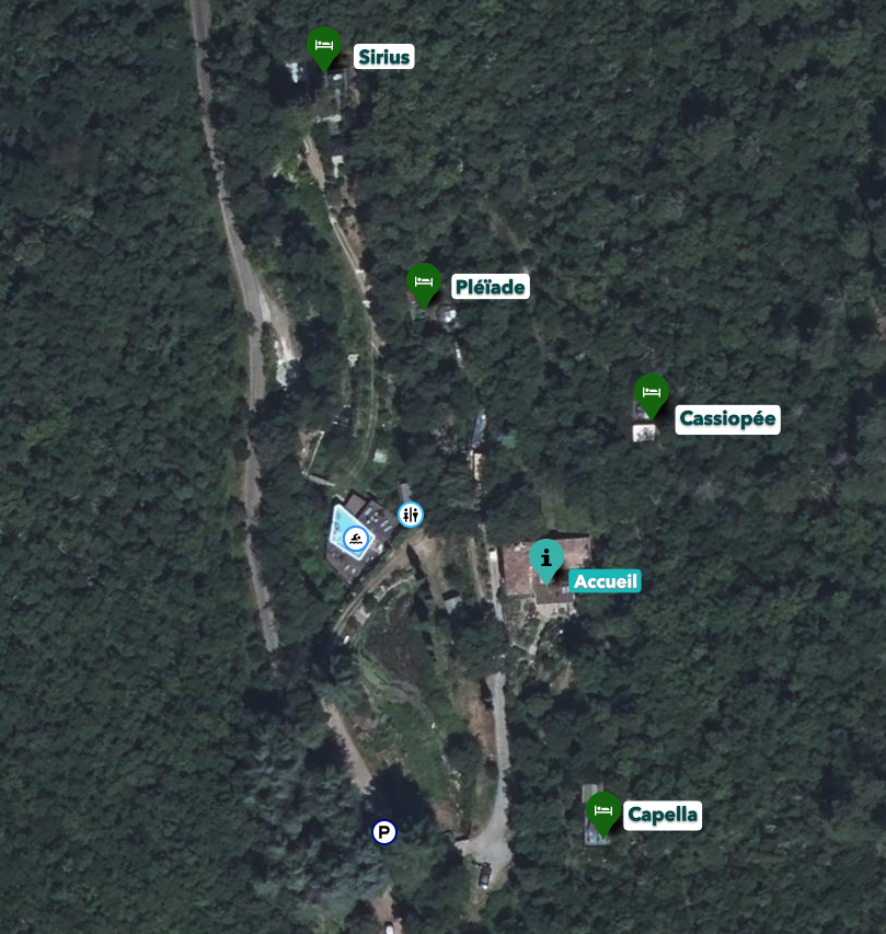 Les douches privatives se situe en contre-bas dans le vallon à côté de la piscine et du spa à hydrojet couvert, en accès libre 24/24H.
